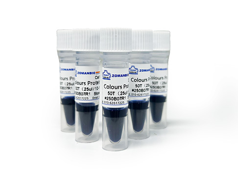 本產品由10-180 kDa的10種純化的天然蛋白混合而成,其中70 kDa為橙紅色蛋白條帶,10 kDa為綠色蛋白條,方便判斷各個條帶的準確位置。產品適合作為SDS-PAGE電泳時變性蛋白樣品的分子量參照,并可實時觀察蛋白樣品的電泳分離狀況,也可用于檢測Western blot的轉膜效率。由于共價結合的染料會影響蛋白質分子的電泳遷移率,本產品僅適于粗略地估計目的蛋白樣品的分子量。