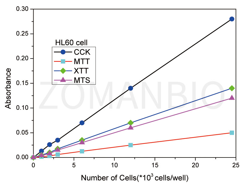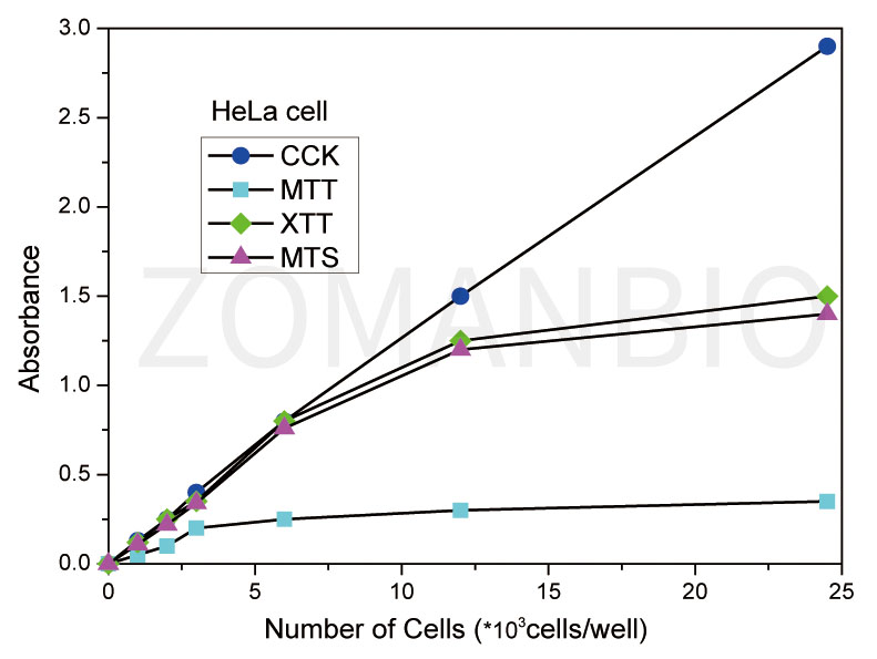 Detection: CCK@450nm;    XTT@450nm;    MTS@ 490nm;    MTT@ 570nm