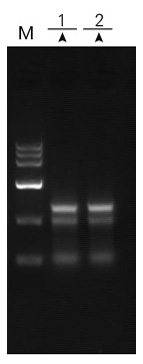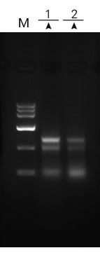 洗脫體積:柑橘果皮60μl、玉米葉片100μl;   RNA電泳上樣量:5μl;   1%瓊脂糖凝膠電泳;   M:DL2000(ZOMANBIO)