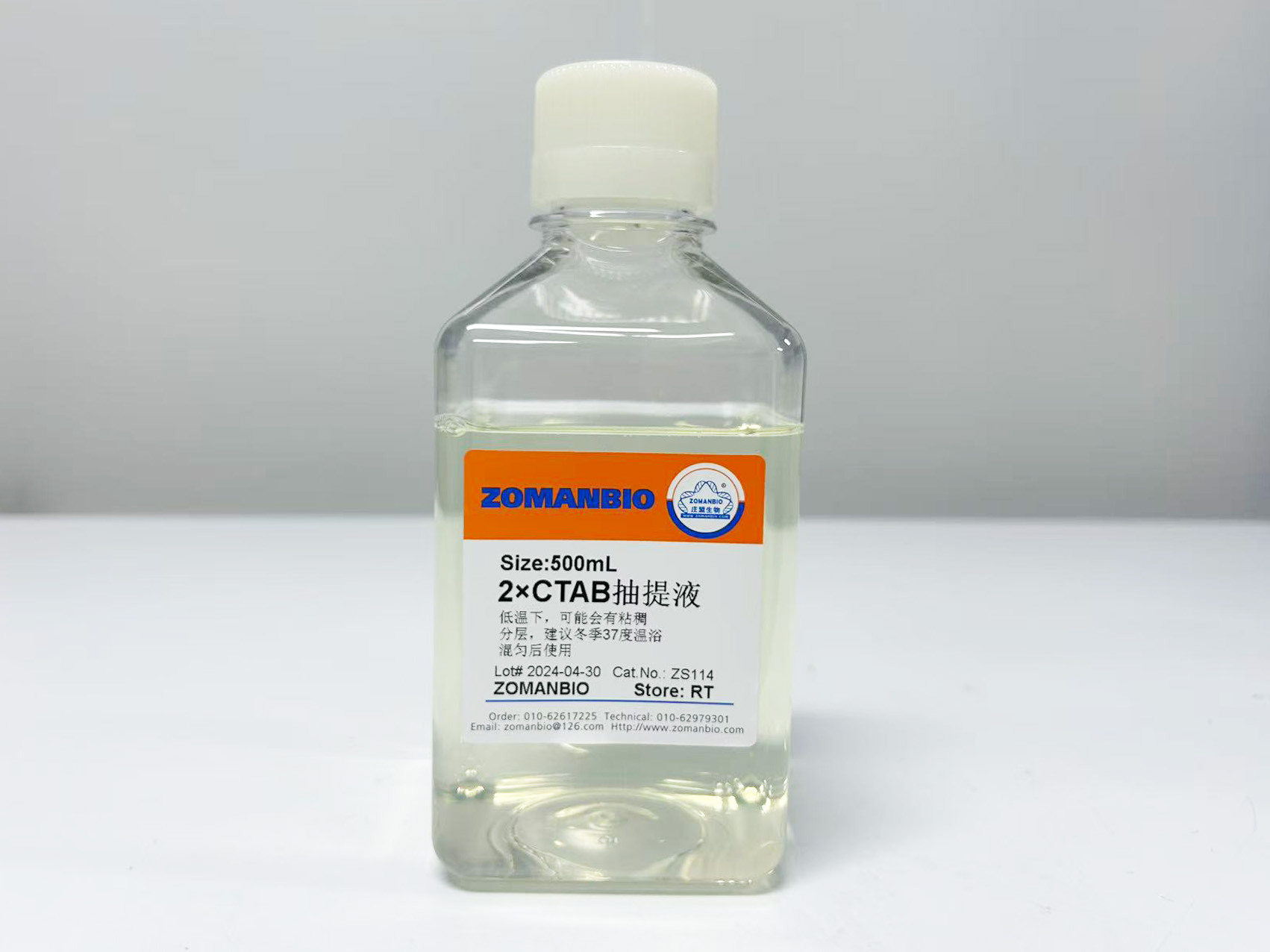 CTAB(hexadecyltrimethylammonium bromide,十六烷基三甲基溴化銨),是一種陽離子去污劑,具有從低離子強度溶液中沉淀核酸與酸性多聚糖的特性。在高離子強度的溶液中(0.7mol/L NaCl),CTAB與蛋白質(zhì)和多聚糖形成復(fù)合物,只是不能沉淀核酸.通過有機溶劑抽提,去除蛋白、多糖、酚類等雜質(zhì)后加入異丙醇沉淀即可使核酸分離出來。本抽提液含有多酚吸附劑,對于水稻,小麥,玉米等常見植物,多酚物質(zhì)不太多的樣品,完全可以不用添加β巰基乙醇。