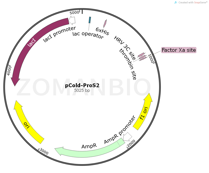 pCold ProS2 DNA 是一種融合的冷休克表達載體,使用來源于革蘭氏陰性菌Myxococcus xanthus中的Protein S作為可溶性標簽。這種Protein S存在于粘細菌的孢子衣中,由173個氨基酸殘基組成,是一種非常穩定的可溶性蛋白質。將兩個Protein S的N-末端結構域串聯,再結合ProS2 Tag的作用,就能使融合目的蛋白的穩定性和可溶性得到提高。此外,由于目的蛋白和ProS2-Tag的相互作用性很低,因此可以將二者有效分離。pCold ProS2 DNA Vector在cspA啟動子的下游插入了5’非編碼區(5’-UTR)、翻譯增強元件(TEE)、His-Tag序列、ProS2-Tag和多克隆位點(MCS)。在ProS2-Tag和多克隆位點(MCS)之間主要是HRV3C Protease、Thrombin和Factor Xa的切斷位點,用來消除融合蛋白質的標簽。此外,在cspA啟動子下游還插入了lac operator,可以嚴格調控目的基因的表達。由于本制品的啟動子是大腸桿菌來源的,所以大部分大腸桿菌都可以作為表達宿主使用。總之,pCold ProS2 DNAVector提供的冷休克技術,能夠促進蛋白質的正確折疊,增加目的蛋白質的可溶性,對于一些棘手的目的蛋白質的表達是一個很好的選擇。